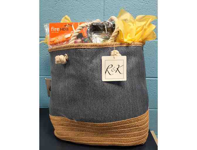 Spring Break Bag donated by Boys Golf consists of a Kindle Fire, Tote Bag, 2 Inflatable Hammocks, 2 Wine Tumblers and a 4-pack of Waterproof Phone Holders