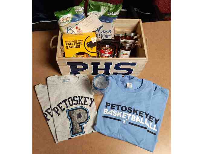 Basket donated by PHS Girls' Basketball is a painted wooden crate that contains 4 t-shirts $50 gift certificate for Plath's meats, 6 pkgs of McCormick's marinade, 3 jars of American Spoon Food salsa, 2 bags of tortilla chips, 3-pack of Buffalo Wild Wings BBQ Sauces, 4 plastic basketball cups