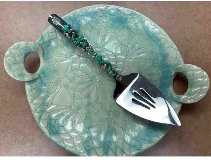 Round green plate with beaded pie server donated by Karen Starkey and Carol Lamberti