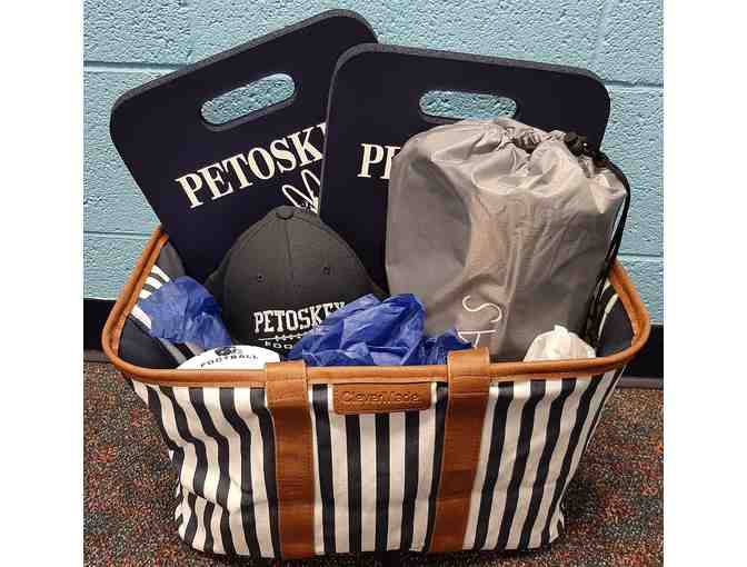 Stadium Care Package donated by PHS Football consists of 2 Northmen foam seat cushions, 1 waterproof blanket, 1 Petoskey Football hat, 2 plastic miniature footballs and 1 stadium basket.