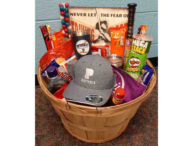 This basket donated by the PHS Baseball Team contains Fireball Whisky 750 ml., Svedka Vodka 750 ml., Babe Ruth Wood Picture, 2 Stainless Steel Tumbler, Northmen Baseball Hat, 4 Pit Spitters Baseball Tickets, Big League Chew Gum, 2 Baseball Bat Bubble Gum, Kars Trail Mix, Baby Ruth Candy, Planters Peanuts,