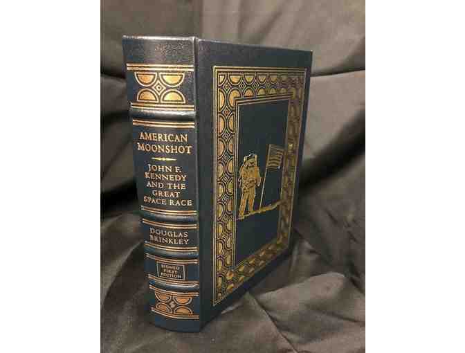 Beautifully leather bound, signed 1st edition book, "American Moonshot, John F. Kennedy and the Great Space Race" by renowned historian, Douglas Brinkley. Read what started the decision to develop NASA, the Apollo project, and others catapulting the US to win the race against the Soviet Union at the height of the Cold War.
