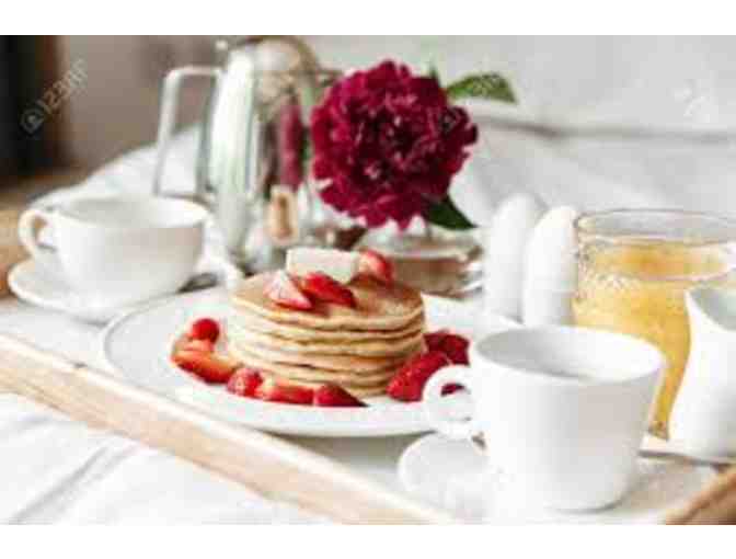 This package includes (2) guest passes for Hale Farm and Village, (1) pint of maple syrup from Goodell Family Farm, (1) $100 gift certificate from Noon Sharpening, Inc. for sharpening services, and a breakfast-in-bed spread consisting of an extra large serving tray filled with a glass pitcher, (2) drinking glasses, (2) plates, (2) kitchen utensils, beverage napkins, and (2) packages of pancake mix.