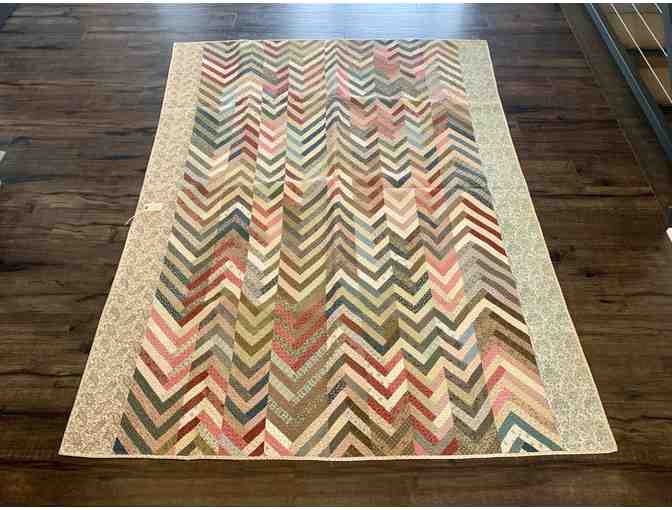 This hand made quilt with a vibrant pattern and colors was hand made by grandparent Jeanne Horton, owner of Country Sampler, a material and home furnishings store in Spring Green. It would be stunning hung on a large blank wall, cozy for a couch, comfy in a bedroom. A family heirloom that will be treasured for generations to come!