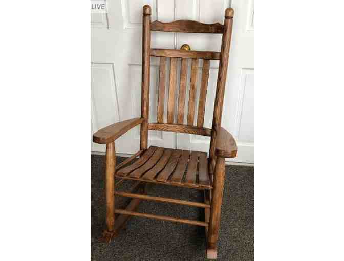 Heavy duty solid oak rocking chair that would be beautiful for a front porch, babies room or den. Sure to become a family heirloom!