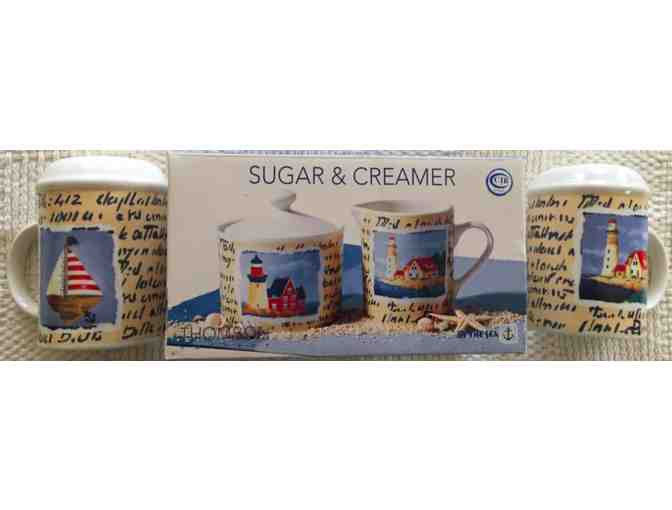 Thomson Pottery lighthouse design sugar and creamer set (new, still in the box) pairs with matching salt and pepper shakers in the same design (not boxed) to complete your nautical-themed table.