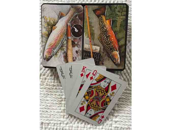 All plastic playing cards. This boxed two-deck set of playing cards features images of trout, a rod butt and reel, and a rod and creel. New, never used.