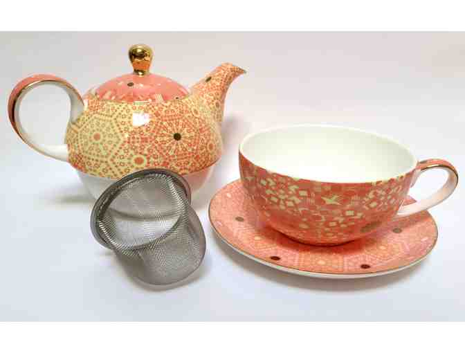 Fine Bone China Tpot for one, cup & saucer, Stainless steel infuser. Gentle hand wash, not suitable for microwave or dishwasher.