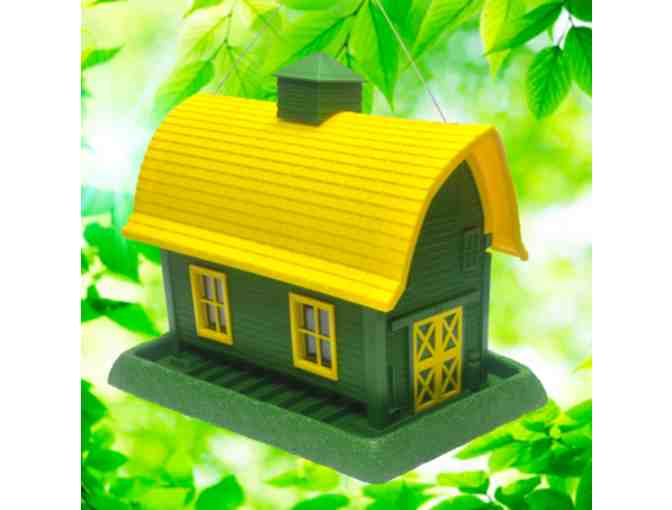 You are bidding on The Village Collection Barn Birdfeeder. This feeder is reminiscent of a country barn with yellow accents and roof. Measuring 14.5 x 10.5 x 11.5 inches high, this feeder has the capacity to hold 8 lbs. of seed. For monitoring seed levels, its windows are framed with clear plastic panes. The roof contains a lift-off cupola to make filling this feeder a breeze. The large tray/perch is removable for easy clean out. This versatile feeder can either be used as a hanging birdfeeder or pole mounted and offers a three year warranty. Made from durable molded plastic, the country charm of this feeder is sure to captivate your feathered friends. Includes 9lb bag of bird food. Donated by Santa Ynez Feed & Shavings.