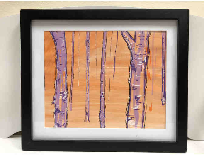 This 11x13 framed glass front painting is a mixed element piece using both acrylic and ink with a palette blend of oranges and purples. “Birches At Dusk” embraces the simple clean lines and purity of nature. Amy Hughes, who is part of Butler Montessori, finds inspiration each day right here on our amazing Campus. “I’ve seen sunsets here that have left me awestruck. Nature is an artist that I just try to imitate.”