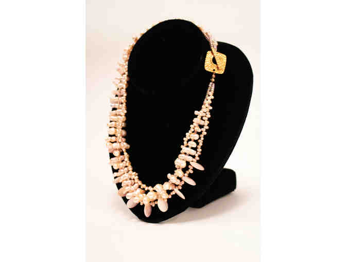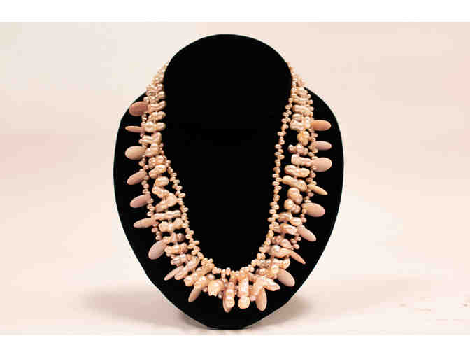 This auction item includes a multi-strand necklace made from freshwater pearls and shell disks with a toggle clasp measuring apx 10" long.