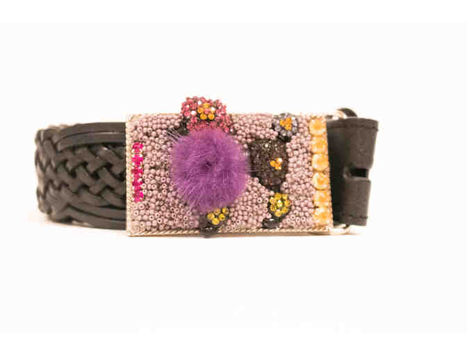 This auction andcrafted Silver Buckle with Rhinestone Poodle- This one-of-a-kind, silver belt buckle features a fabulous poodle with rhinestones and pom poms. Also inclued is a black leather snap-on belt, size small.