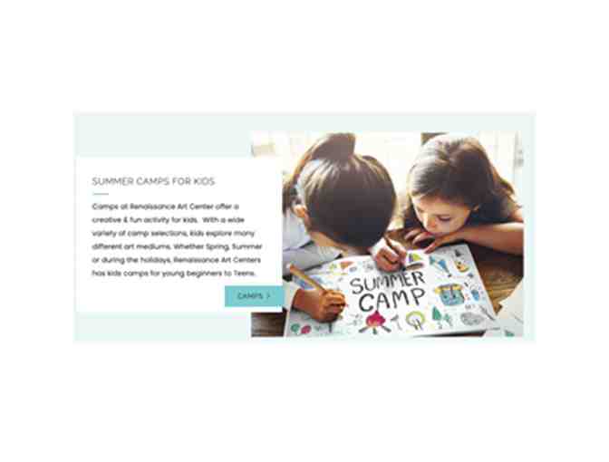 $50 off 1 week of full day summer camp in 2020! This includes 2 camps: one in the morning and the other in the afternoon. Renaissance Art Center is conveniently located in Gaithersburg, off Shady Grove Rd/I-270. Beginner level to advanced portfolio building. Drawing & Painting, Ceramics & Digital Arts. Classes (Sept.-June) 3.5 yrs.- teen and Summer Camps (June-Aug) 5 yrs. - teen. See our website www.rcarts.com for additional information or call 301.987.0377. Expires: August 28, 2020. Does not apply to Birthday Parties or Spring Break Camp.