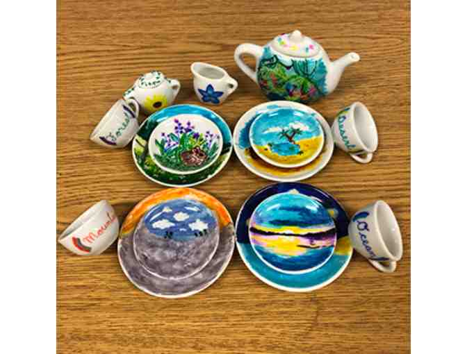 Nature Inspired Tea Set - hand painted by Intermediate students. During one of their Creative Expressions classes, students decorated four cups and saucers, a teapot, creamer, and sugar dish to represent different natural biomes around the world.