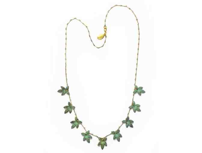 Fine floating verdigris foliage charms flutter oh so perfectly from a brass chain. Measures 26 inches long. From our friends at We Dream in Colour.