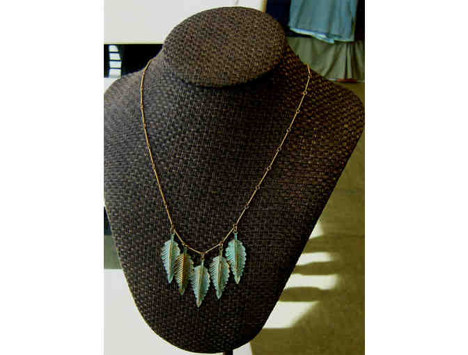 Five brass leaves are dipped in patina and hung from a long brass rod chain necklace. The chain measures about 25 inches long. From our friends at We Dream in Colour.