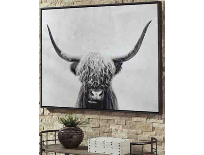 Bring home a piece of Scottish livestock with Pancho wall art. Highland cow looks straight ahead with shaggy hair and prominent horns, creating a beautiful white negative space. Sleek black frame creates a boundary and makes a statement in your home.