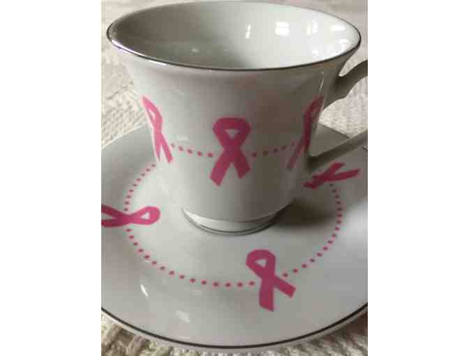 As a daily mindfulness ritual, you can list your daily gratitudes as you treat yourself to a cup of tea in a silver-rimmed tea cup and saucer that feature pink ribbons all around.