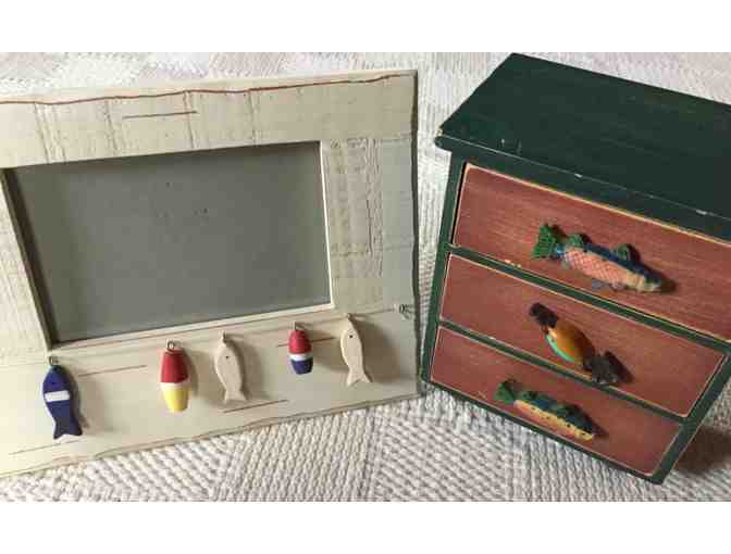 Looking for a few cute items to round out your fishing-themed room? Check out this trinket chest with fish handles and picture frame with bumpers and lures. Perfect, right?! Frame measures 7.375in x 9.5in with a 3.5in x 5.5in opening for a photo or postcard. The 3-drawer chest is 3.75in x 6in x 6.5in. Used, slightly distressed.