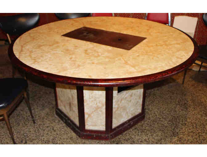 With a square base and round table top, these tables remain from the Sea-Hi’s original opening. Tables feature metal plates in the middle that can hold a warming station. Table is not outfitted for power or heat. Sold as is.