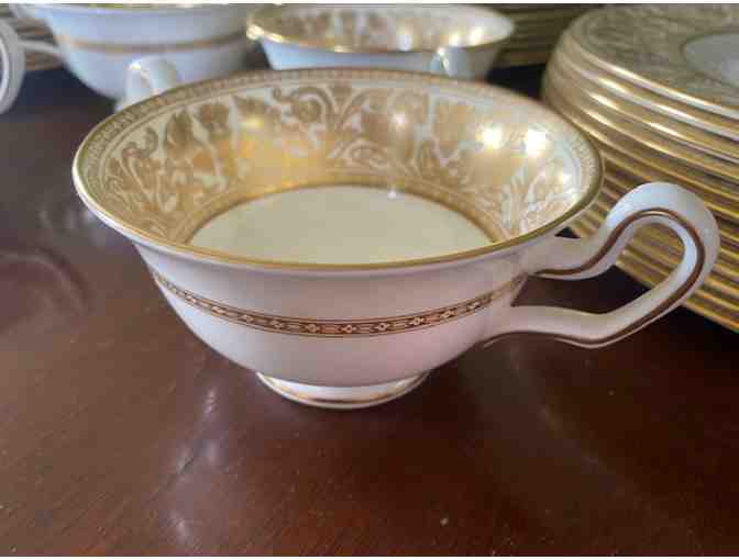 Wedgwood Florentine Gold China. Pattern W4219. 40 pieces total. 12 dinner plates, 12 salad plates, 12 bread plates, and 4 cream soup cups in wonderful condition. Florentine Gold is a luscious, lavish Wedgwood pattern with a heavy gilded presence designed to make a statement of luxury and class, which it truly does. This elegant set has a scrolling border of gold outlined dragons on white body. Set dates back to between 1962-1986.