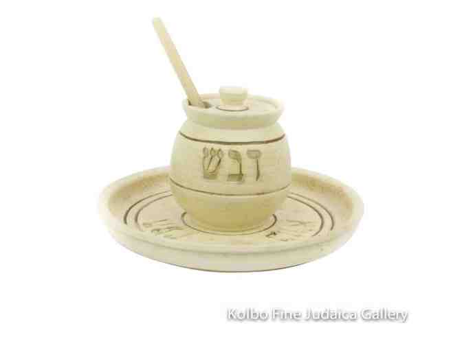 Celebrate sweetness in the new year with this beautiful ceramic honey and apple set! The jar bears the Hebrew word for “honey” and the plate features the Hebrew prayer over fruit. A perfect housewarming or wedding gift, this set can also symbolize a sweet new life as well. This set was crafted by a husband and wife team who have been creating Jewish pottery for over thirty years.