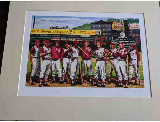 Shown in this painting are some of the Cincinnati legends from this great team: center fielder Gus Bell, catcher Ed Bailey, pitcher Brooks Laawrence, catcher Smoky Burgess, right fielder Frank Robinson, pitcher Joe Nuxhall, first baseman Ted Kluszewski, shortstop Roy McMillan, left fielder Wally Post, and second baseman Johnny Temple.