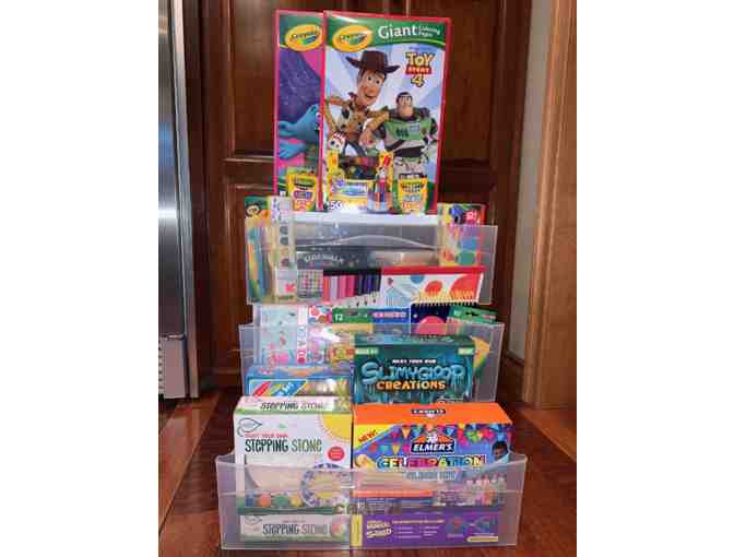 Get creative with this basket filled with arts and crafts. Markers, crayons, clay, paint, coloring pads, slime kits, craft kits and more. All contained in rubbermaid drawers for storage.