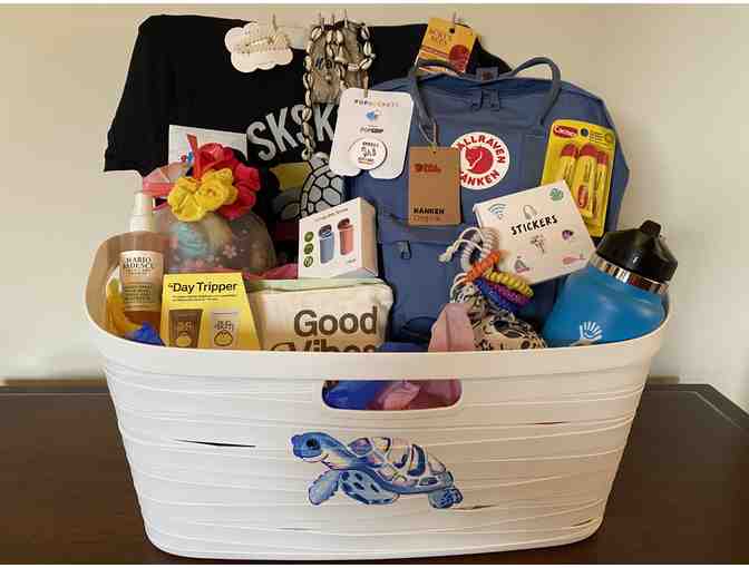 Calling all tweens who are in the know about the latest trending must haves! This basket contains a Fjallraven Kanken backpack and laptop carrier that's dirt and water resistant, a wide mouth 32 oz. Hydro Flask with a straw lid, a set of 60 velour scrunchies, a set of 20 colorful no-crease spiral coil hair elastics, pomegranate Burt's Bees Lip Balm, a 3-pack of Carmex, 2 collapsible reusable straws, a Sun Bum Premium Day Tripper sunscreen and lotion pack, Mario Badescu Facial Spray with Aloe, Herbs and Rosewater, 170 reusable vinyl stickers for your Hydro Flask, ipad or locker, a shell necklace and bracelet combo, a Tie Dye "Save the Turtles" pop socket and a coordinating "Sksksk And I Oop Save the Turtles" women's cut t-shirt.