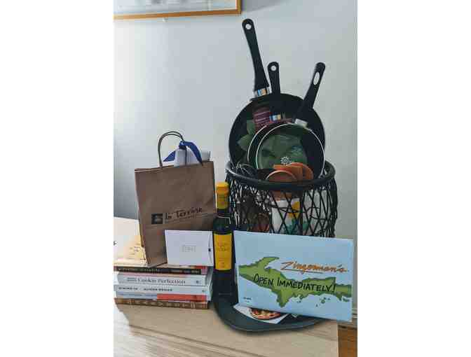 Stay in and enjoy everything your family needs from the families in class 605 to prepare and devour delicious and beautiful meals, snacks and desserts. Includes a mini-library of gorgeous cookbooks: Where Cooking Begins: A Modern Approach to Cooking at Home (Clarkson Potter); Half Baked Harvest Super Simple: Easy Comfort Foods (Potter); Dining In: Highly Cookable Recipes (Potter); Martha Stewart's Cookie Perfection (Potter); and a signed copy of A Fistful of Lentils by Class 605 parent Jennifer Abadi! This basket includes what you need to make much of what you'll find in the cookbooks, including gourmet olive oil from Zingerman's, one package of dried mint; one package of shwarma spices; a measuring cup filled with wooden kitchen utensils (slotted spoon, spoon, whisk (with wooden handle), silicone spatula (with wooden handle), wooden spatula, wooden cutting board, elegant wooden salad tongs shaped like branches; colorful measuring spoons; a round pizza/baking pan, a set of 3 Eco-lution non-stick pans (saucepan, and small and medium-sized frypans, a stylish NYC-themed dish towel, and a cornucopia of gift cards and certificates to help with ingredients ($100 to Zingerman's mail order gourmet foods) and serving ($100 to La Terrine, a stylish housewares boutique on the UWS; $20 to CB2; a handy lazy susan) -- plus a gift certificate to Shake Shack if you want a break from all that cooking! :)