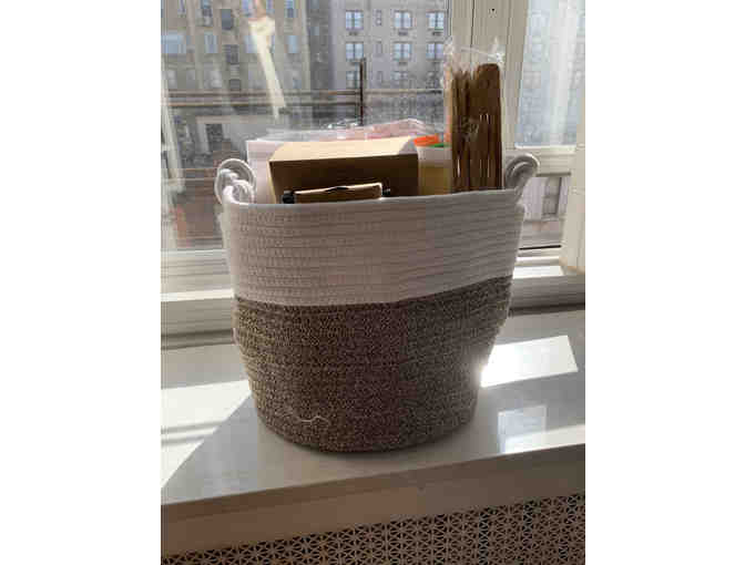 The families from class 606 put together a sustainability basket that contains reusable storage and shopping bags, metal straws, reusable meal kit, wood utensil set, and a cotton/twine basket.