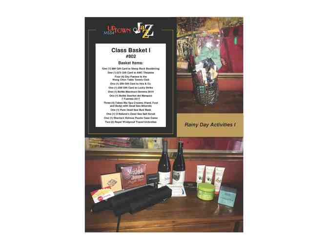 Whether your idea of a rainy day activity is setting out for an adventure at a rock climbing gym or staying in and solving puzzles (or maybe it's sending the kids out to a table tennis club while you stay at home to soak in the tub!), this basket from the families in 802 gives you lots of options. Specific items: Hex & co. gift card, AMC Theatre gift card, Wang Chen Table Tennis Club day passes, Lucky Strike bowling alley gift card, Steep Rock rock climbing gym gift card, the Sherlock Holmes Puzzle Case game, Bio Spa body, hand and foot creams with Dead Sea minerals, O Natural's Dead Sea Salt Scrub, Pure Dead Sea Mud Mask, Massican Gemina 2014 California White Wine, Suertes del Marques 7 Fuentes 2017 Wine, and two Repel windproof umbrellas.