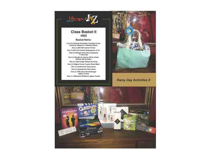 Whether your idea of a rainy day activity is setting out for an adventure at the American Museum of Natural History or staying in and playing games (or maybe it's sending the kids out to pick out a few books while you stay for a home spa day!), this basket from the families in 802 gives you lots of options. Specific items: AMNH general admission vouchers, Shakespeare & Co. bookstore gift card, iTunes gift card, 1000 piece Brilliance jigsaw puzzle, 1000 piece Ravensburger jigsaw puzzle, Codenames party game, Guesstures party game, Clinique Great Skin Anywhere 7 piece set, Straight to Heaven White Cristal Shower Gel by Kilian, Gold Knight Parfum by Kilian, and Origins Flower Fusion Sheet Mask.