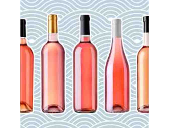 French Provencal wicker basket filled with rose wines (gourmet, sparkling, and large format 1.5 liter), beautiful rose gin and some essentials including a corkscrew, wine bucket, apron, sunglasses, rose gummies, branded pink shirt, glasses for the beach and more!