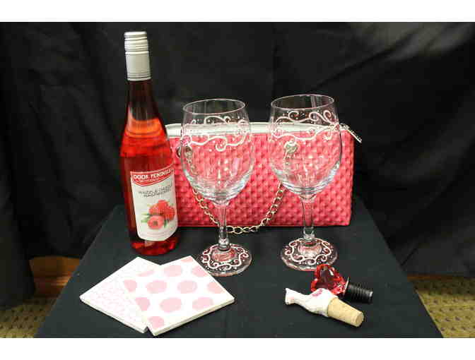 Share a bottle of wine with your BFF! This basket includes a pink insulated wine tote, a pair of hand-painted wine glasses, a pair of wine stoppers, two hand-made coasters, and a bottle of Razzle Dazzle Raspberry wine from Door Penninsula Winery.