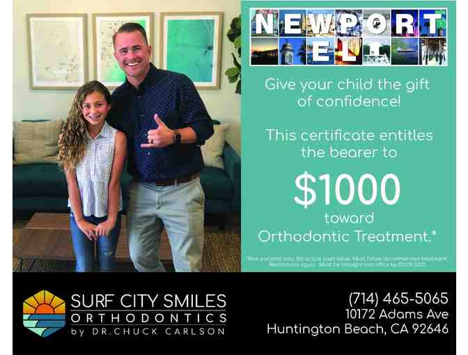 $1000 gift certificate towards orthodontics treatment from Surf City Smiles Orthodontics.