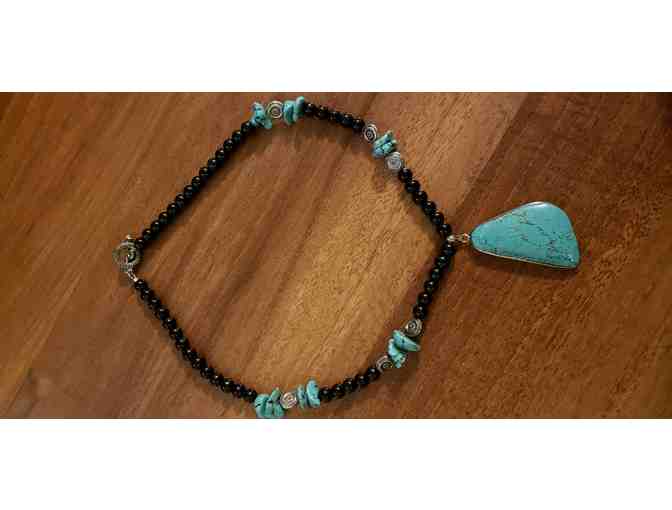 This beautiful necklace was handcrafted by Valerie Dickison. The necklace has black glass beads, turquoise chunks, silver-plated spacers, and a magnesite drop pendant.