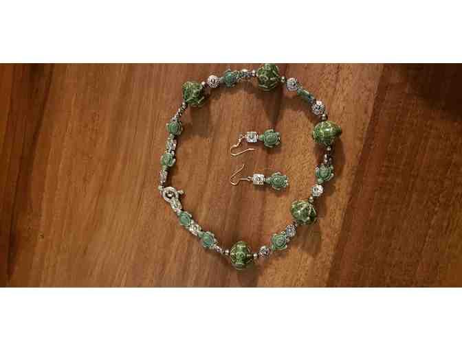 This darling handcrafted jewelry set includes a necklace and earrings are created with beads in "frog skin" print and "turtles" print.