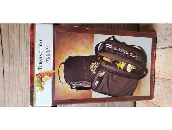 This packaged set includes a wine bottle carrying case, a corkscrew and goblets in a boxed set from Turning Leaf.