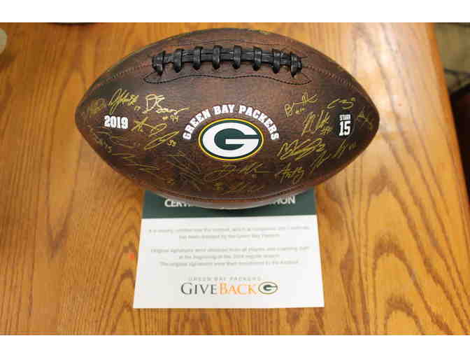 This 2019-2020 season collectible football donated by the Green Bay Packers is a great symbol of another awesome Packer season! Original signatures were obtained from all players and coaching staff at the bginning of the 2019 regular season. The original signatures were then transferred to the commemorative football. The Certificate of Donation lists all the coaching staff and players with their jersey numbers. A great collector's item!