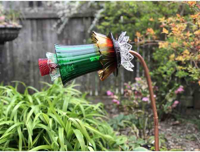 The lucky winner of this item will take home a glass flower and copper stand, handcrafted by artisan Mary Kay Andersen for Flower 2 Power. This beautiful piece of art is made from reclaimed and recycled Depression antique glass. The flower can be displayed in a garden, flower bed or other place of your choosing.