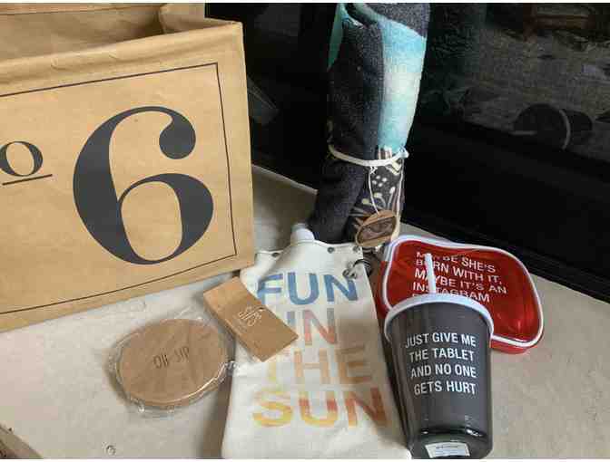 Everything you need for relaxing fun in the sun!  Inside the reusable tote bag you will find a 31”x65” beach towel, a “Fun in the Sun” wine/beverage canteen, set of 8 drink coasters, 12oz tumbler, and small see-thru bag.