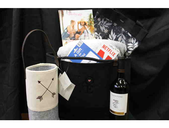 Now that there are many a night at home, warm up with this tote full of coziness featuring a super soft blanket, bottle of wine, and a $25 Netflix gift card to watch those new releases. Also includes a $50 Pick 'n Save gift card, Thirty-one round felt bag, floral essential tote, and large "Love" felt tote... all from Thirty-one rep and parent Rebekah Tuite!