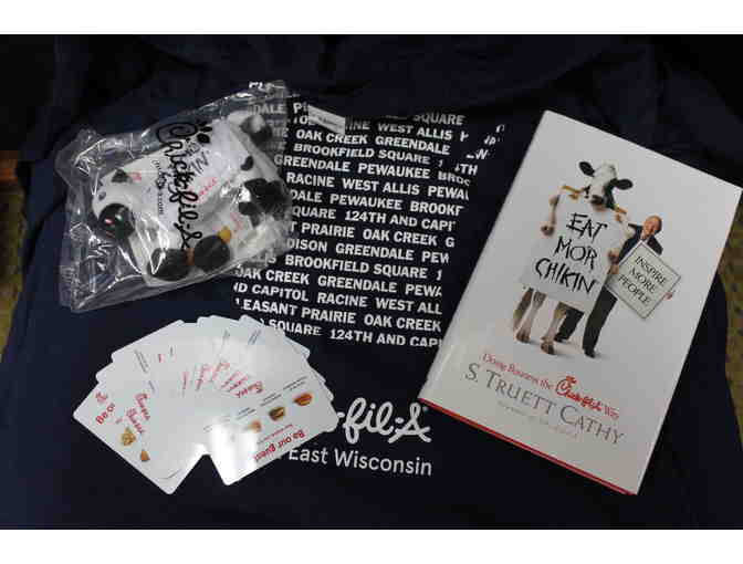 There are lots of treats in this Chick-Fil-A box, including 12 gift cards for a party platter, plus sandwiches, salads, and more. Also includes an Adult XL t-shirt, the Chick-Fil-A founder's inspring memoir, and the famous "Eat More Chikin" cow!