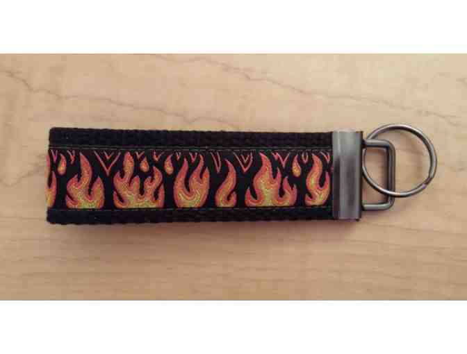 Heavy black twill with woven flame ribbon. Size: about 5” x 1.25” exclusive of ring.