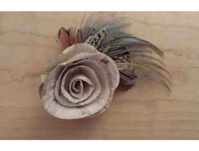 Handmade taupe paper flower with chestnut, gray-blue & brown feathers. A sturdy clip on reverse of 4" x 2" fascinator. Made by a fly fisherman and fly tying devotee.