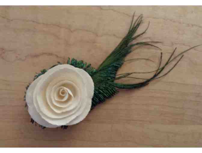 Handmade cream paper flower with iridescent green feathers. A sturdy clip on reverse of 3" x 2" fascinator. Made by a fly fisherman and fly tying devotee.