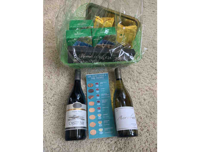 This quarantine survival kit comes with two bottles of wine, four boxes of girl scout cookies that pair well with them, a platter, and a sign that reads, "Home is Where the Wine Is."