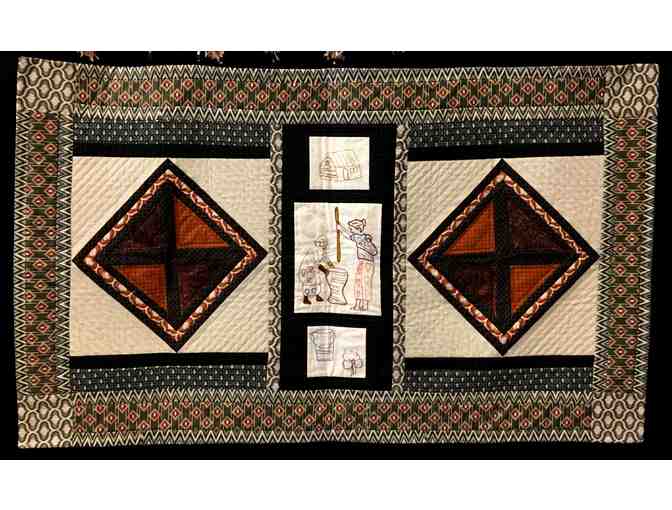 Patricia struggled with her design because her Malian block contained so much white space. She decided to separate the block into three vertical squares and used dark fabric that picked up the thread colors and—she hoped—resembled mud cloth.