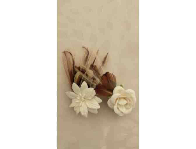Handmade with ivory & white paper flower each on a fan of white, brown, tan, and black feathers. A sturdy clip on reverse of each 3.5” x 2” and 1.25” x 3.75” clips. 5" x 3". Made by a fly fisherman and fly tying aficionado Jim Dickinson.